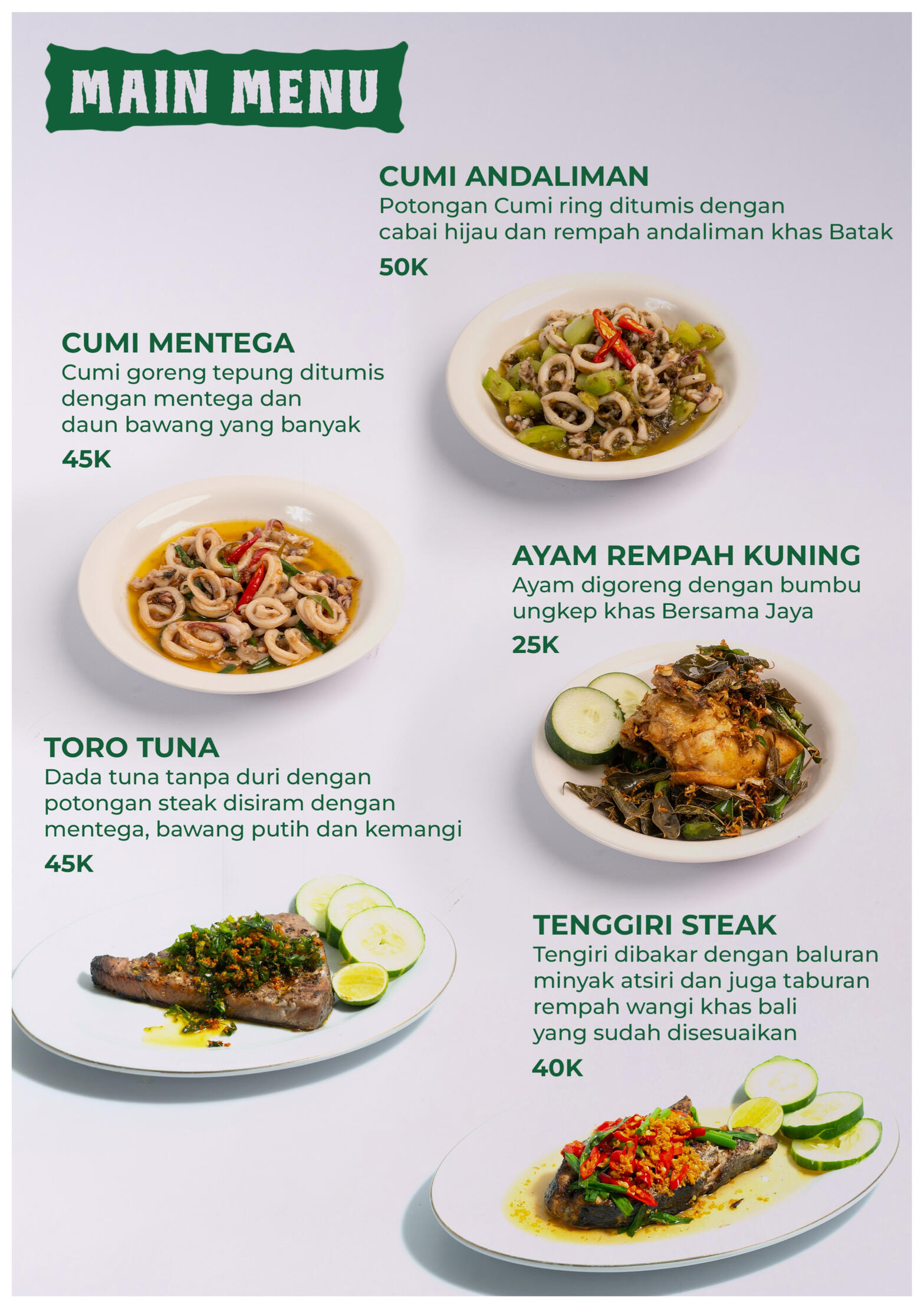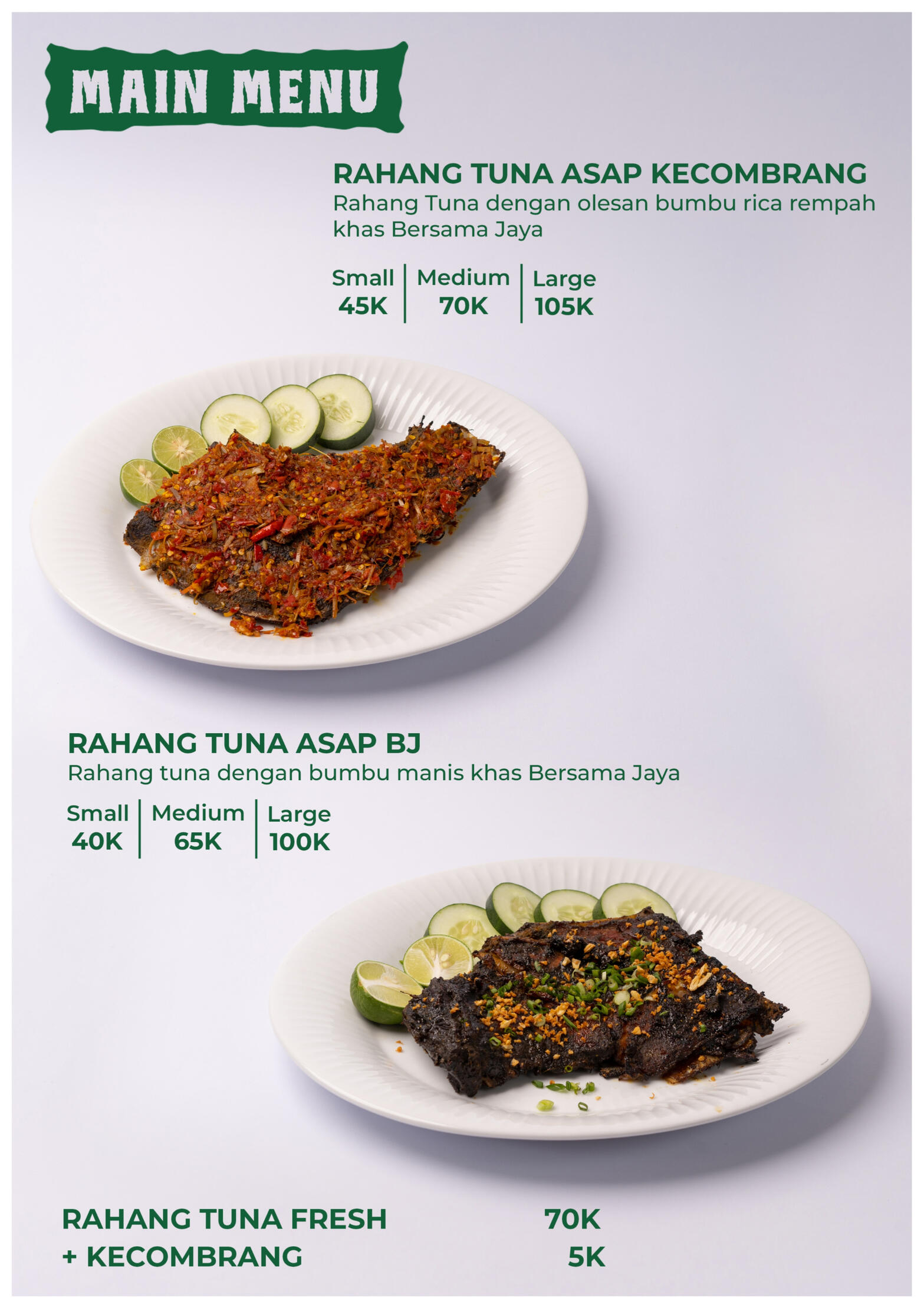 Bersama Jaya merupakan usaha yang bergerak di bidang Food and Beverage dan berdomisili asli Kota Malang. Kami menyediakan hidangan olahan seafood asap dan temannya, dengan produk unggulan yaitu Rahang Tuna Asap bakar, dengan penjualan mencapai rata-rata 400 porsi setiap harinya. Cabang pertama berlokasi di Pasar Terpadu Dinoyo Blok AA1 no.4&5 Kota Malang dan telah berjalan selama kurang lebih 12 bulan. Dan cabang kedua berlokasi di Pertokoan Kayutangan No.6-G, Klojen, Kota Malang yang beroperasi sejak Oktober 2024.